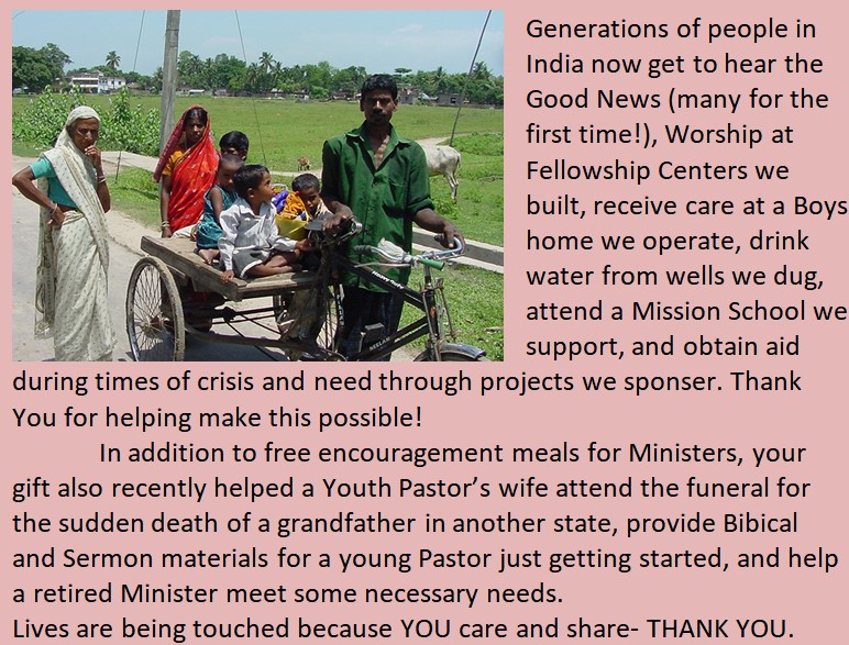 The Mission of Friends of India is to Promote and Preserve the Ministry God has developed among Free Will Baptists in India. Funds provided by contributors to Friends of India enable us to support ongoing projects while we continue to expand the ministry of reaching souls, building churches, and establishing disciples as followers of Christ. Other social, educational, and religious works such as disaster relief, Bible Institutes, and life style improvements (such as water supplies) for the people of India are helped by this ministry.
