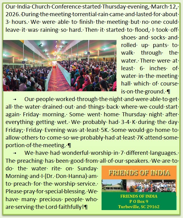 The Mission of Friends of India is to Promote and Preserve the Ministry God has developed among Free Will Baptists in India. Funds provided by contributors to Friends of India enable us to support ongoing projects while we continue to expand the ministry of reaching souls, building churches, and establishing disciples as followers of Christ. Other social, educational, and religious works such as disaster relief, Bible Institutes, and life style improvements (such as water supplies) for the people of India are helped by this ministry.